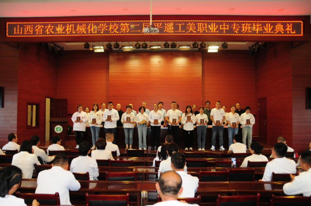 9月9日,山西省农业机械化学校举行第二届平遥工美职业中专班毕业典礼。学校校长张肖洁,平遥县政府副县长张旭峰,晋中市城镇集体工业联合社工美办主任侯振常,平遥县文化和旅游局局长郭效云,平遥县城镇集体工业联合社主任杨怀元等11名领导出席了会议。大会由学校教务处主任王森栋主持。