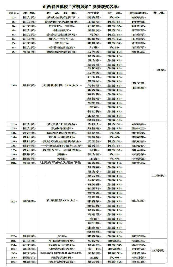 我校成功承办了车工、钳工、农机修理等五项技能大赛,省人大副主任田喜荣、省政协副主席朱先奇、省教育厅厅长张文栋、省农机局局长左义河等上级领导亲临我校赛场,为本届大赛拉开了帷幕。同时,我校组织师生参加了18个项目的技能大赛,巩丽等6名学生、侯银鹰等1名教师获得一等奖,11名师生获得二等奖,14名师生获得三等奖,16名师生获得优秀奖;参加了8项“文明风采”竞赛,共获一等奖10个,二等奖12个,三等奖6,优秀奖4个;赵吉艳等27名教师获优秀指导教师奖,裴秀萍老师获优秀组织工作者奖。